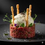 (x10)A refined masterpiece of hand-cut prime beef tenderloin, seasoned with shallots, capers, and cornichons. This signature dish is crowned with a light-as-air Parmesan and black truffle mousse, providing a rich, earthy contrast. Served with delicate, golden-brown rice croutons for a unique, gluten-free crunch.